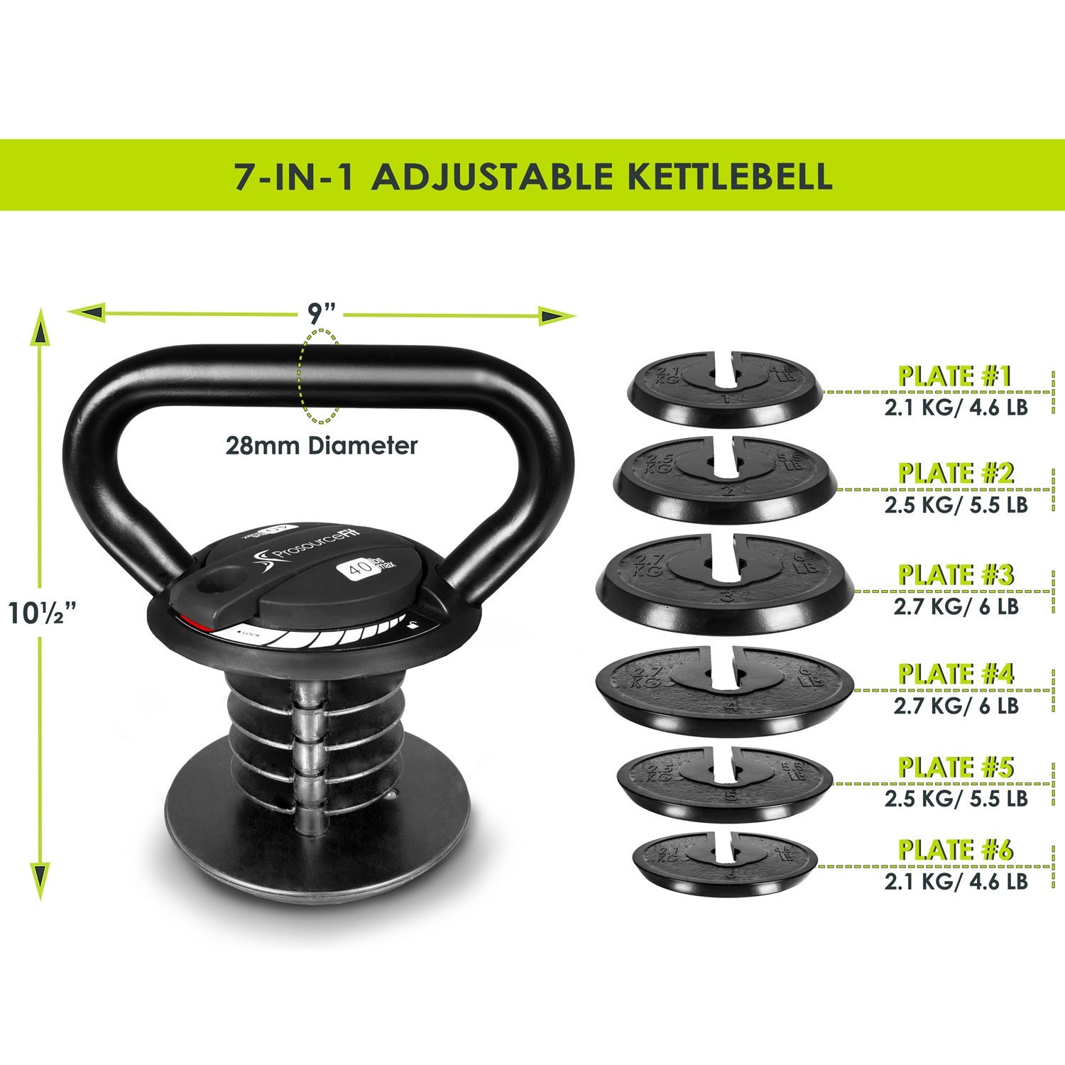 The weight classes you need all in one kettlebell. The ProsourceFit Adjustable Kettlebell allows you to adjust weight between 10 lb and 40 lb by easily attaching/removing 5 lb disks. The secure power lock on top keeps disks in place as you swing, lift, or press.