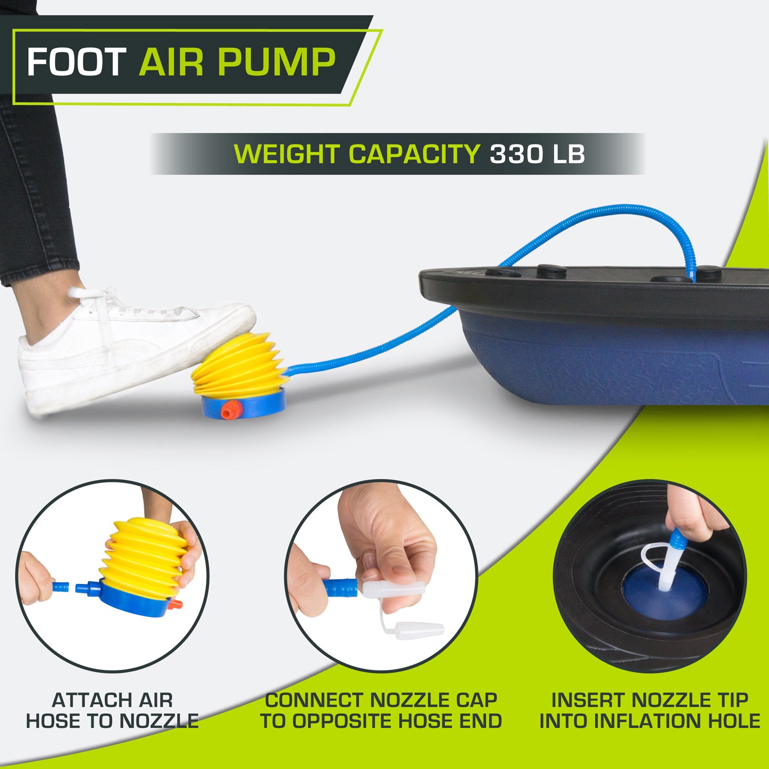 No matter if you’re a fitness elite or just getting into the workout game, the ProsourceFit Balance Trainer offers full body results for every level! Designed with versatility in mind, the number of exercises possible on this half exercise ball are endless! Train on the dome side or flip it over and balance on the platform side during workouts to add a new challenge. The attachable resistance bands offer 15 to 20 pounds of resistance so you can add more burn to your upper body workout all while toning your core through balance. Feel secure when standing on the half dome with the textured grip pattern designed to provide stability and non-slip footing. Using the convenient air pump, inflate the dome to the desired level for safe use and deflate the balance trainer after workouts to store under the bed, closet, or garage. Made from burst resistant PVC and rubber, the balance ball can hold up to 330 pounds.
