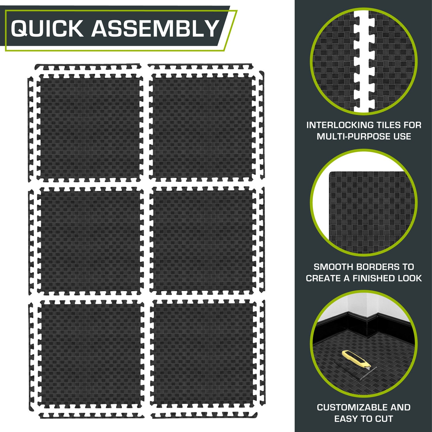 The ProsourceFit Checkered Exercise Puzzle Mat 1-inch is your answer! Whip up your home gym in seconds: just detach the foam mats’ 12 end borders, connect the mats like a puzzle, and snap the end borders back on for a clear finish. Each 24x24-inch tile is built with extra-thick, 1-inch shock-absorbing, water-resistant EVA foam, providing unmatched cushioning and stability for heavy weights, high-impact exercises and frequent use. The enhanced traction surface keeps you secure even during sweaty sessions, while the resilient tiles bounce back ready for your next challenge. Need to store them? No problem! Simply detach and stack the tiles for space-saving convenience. This set includes 6 tiles and 12 end borders, but for lighter padding more compatible with residential spaces, check out our ½-inch thick checkered tiles. Go ahead, and push your limits without worry – your personalized, ultra-durable gym awaits!