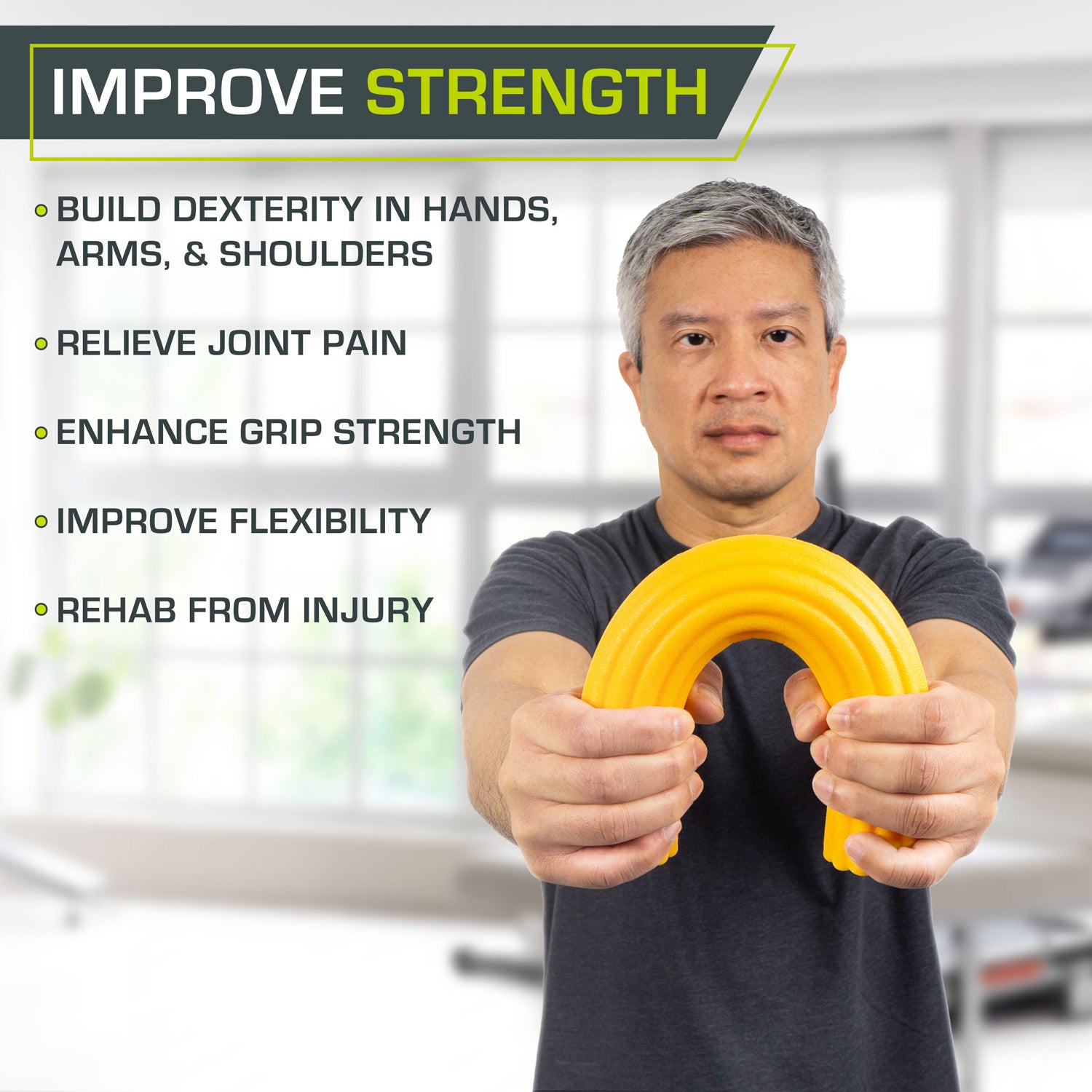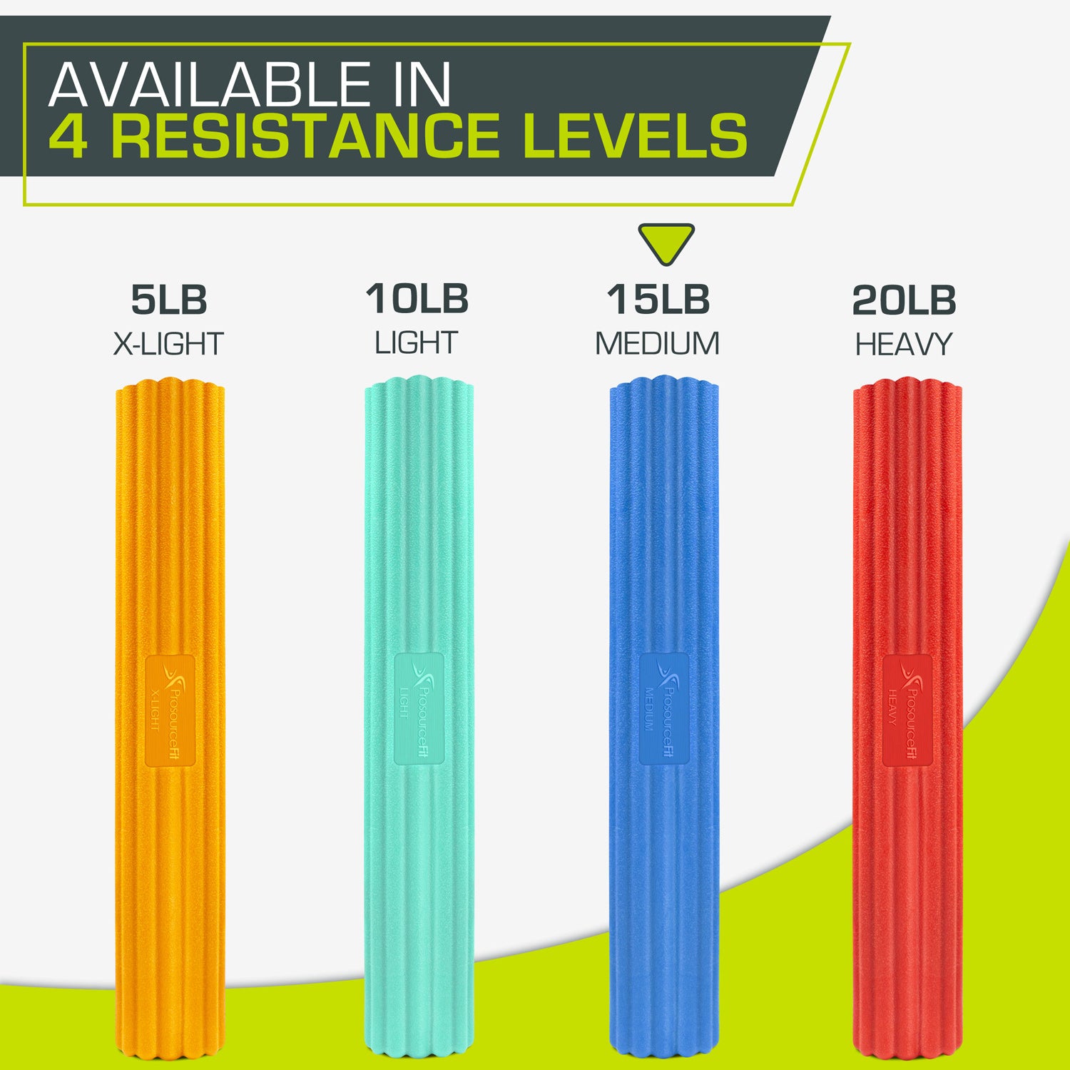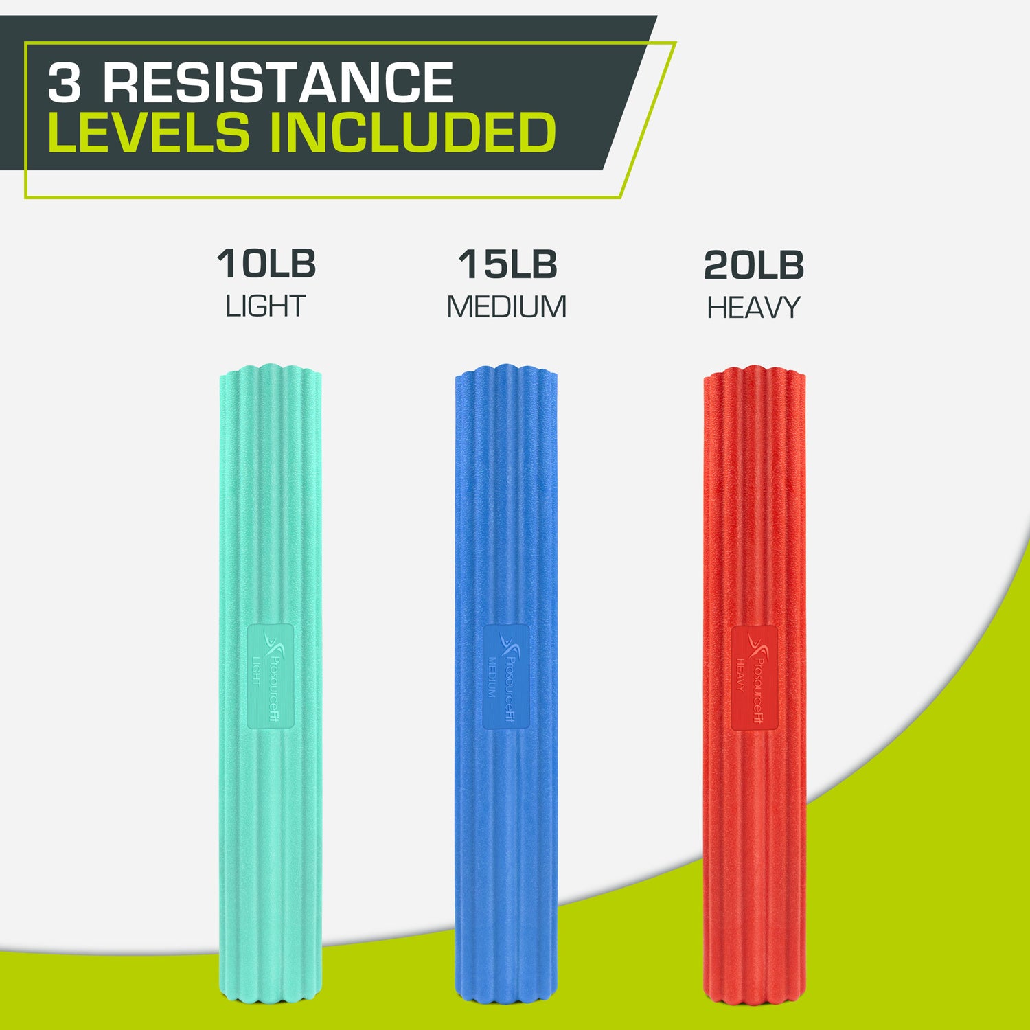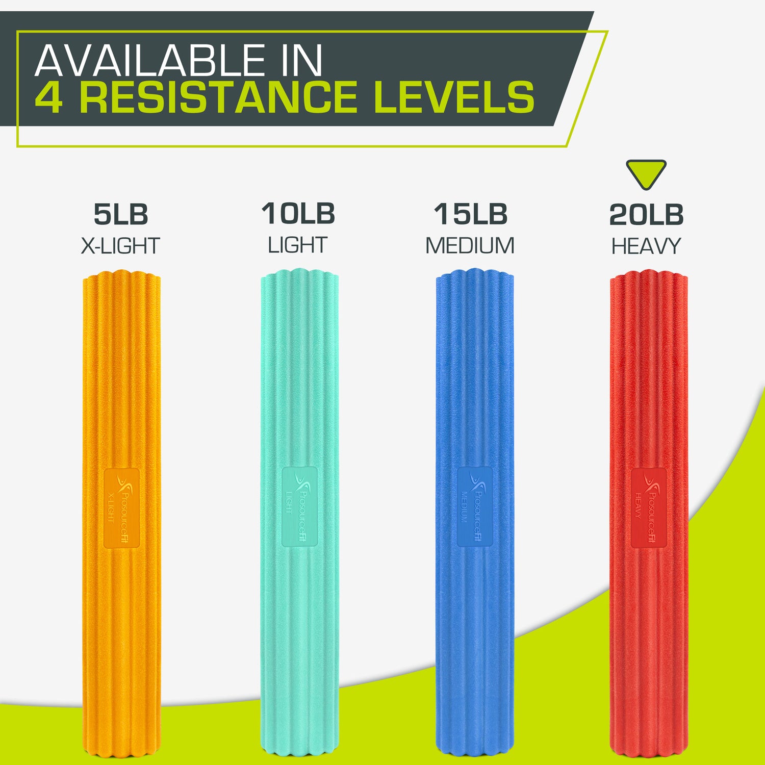 Our flex bars are an at-home or on-the-go therapy treatment that simultaneously serves as an athletic performance tool. We offer twist bars in 4 varying levels of resistance that allow you to gradually regain strength in overused tendons, rehab weakened wrists, and strengthen joints. Ridged surfaces allow for non-slip grip and aid to stimulate deep tissue when applied firmly against wrists, forearms, or the flat of your feet. Made from Thermoplastic rubber (TPR), the twist and bend bars are elastic and resilient to heavy use, allowing them to deform under stress and return to their original shape when the stress is removed. At 12 inches in length and less than 1 pound each, each bending bar is the ideal companion for on-the-go physical therapy. The bars are color-coded to indicate different resistance levels, ranging from 5 to 20 pounds. Resistance Levels • Yellow- 5 pounds • Green- 10 pounds • Blue- 15 pounds • Red- 20 pounds. Set of 3 consists of green, blue, and red bars; Set of 4 consists of all 4 levels.