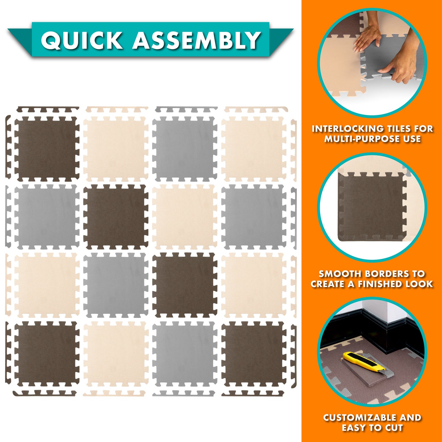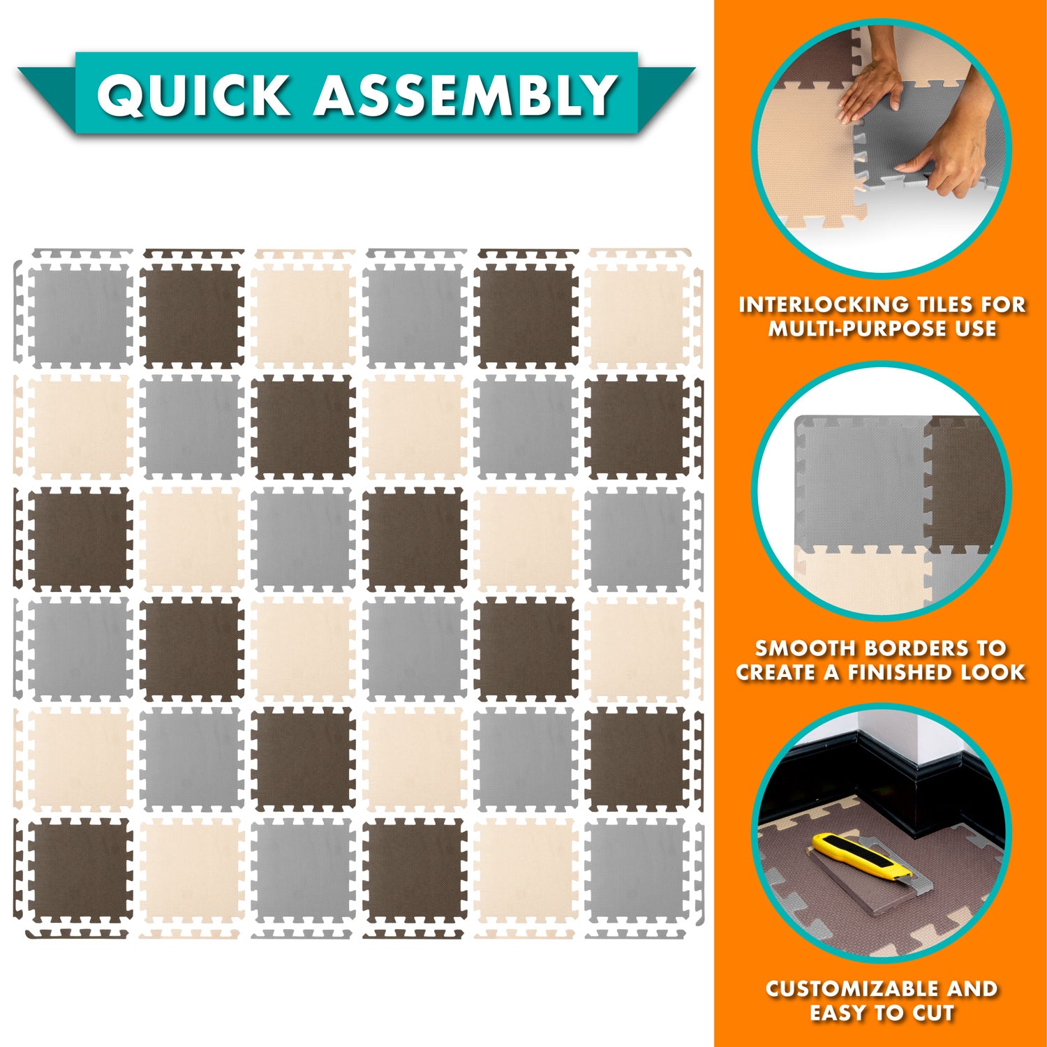 - Each tile measures 12-in x 12-in x ⅜-in thickness; includes 36 tiles and 24 end borders