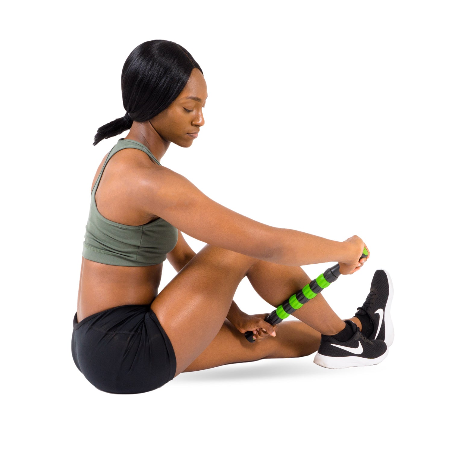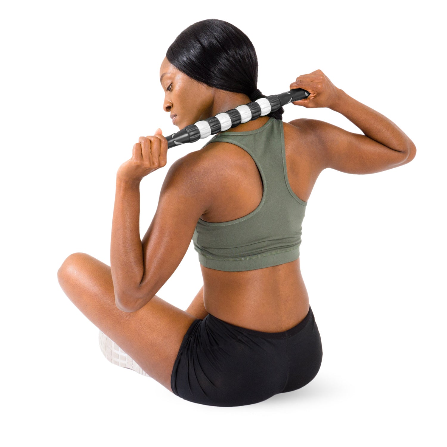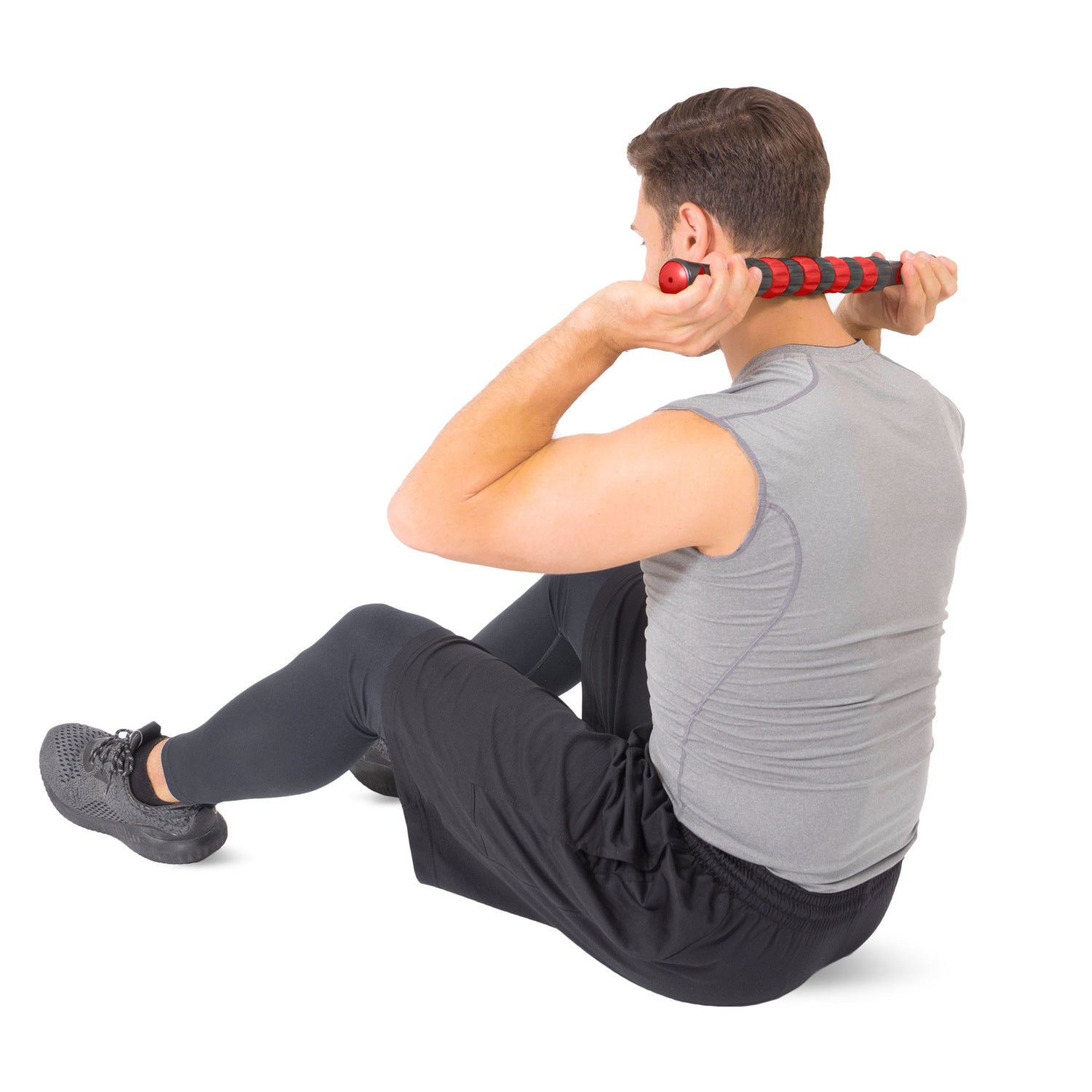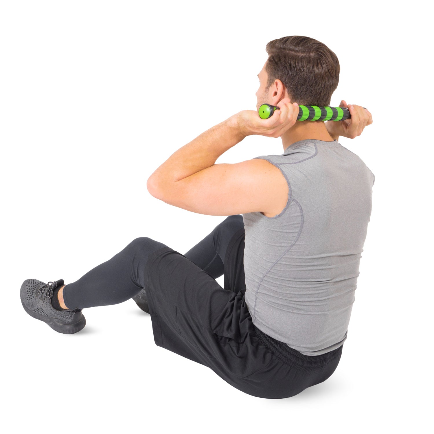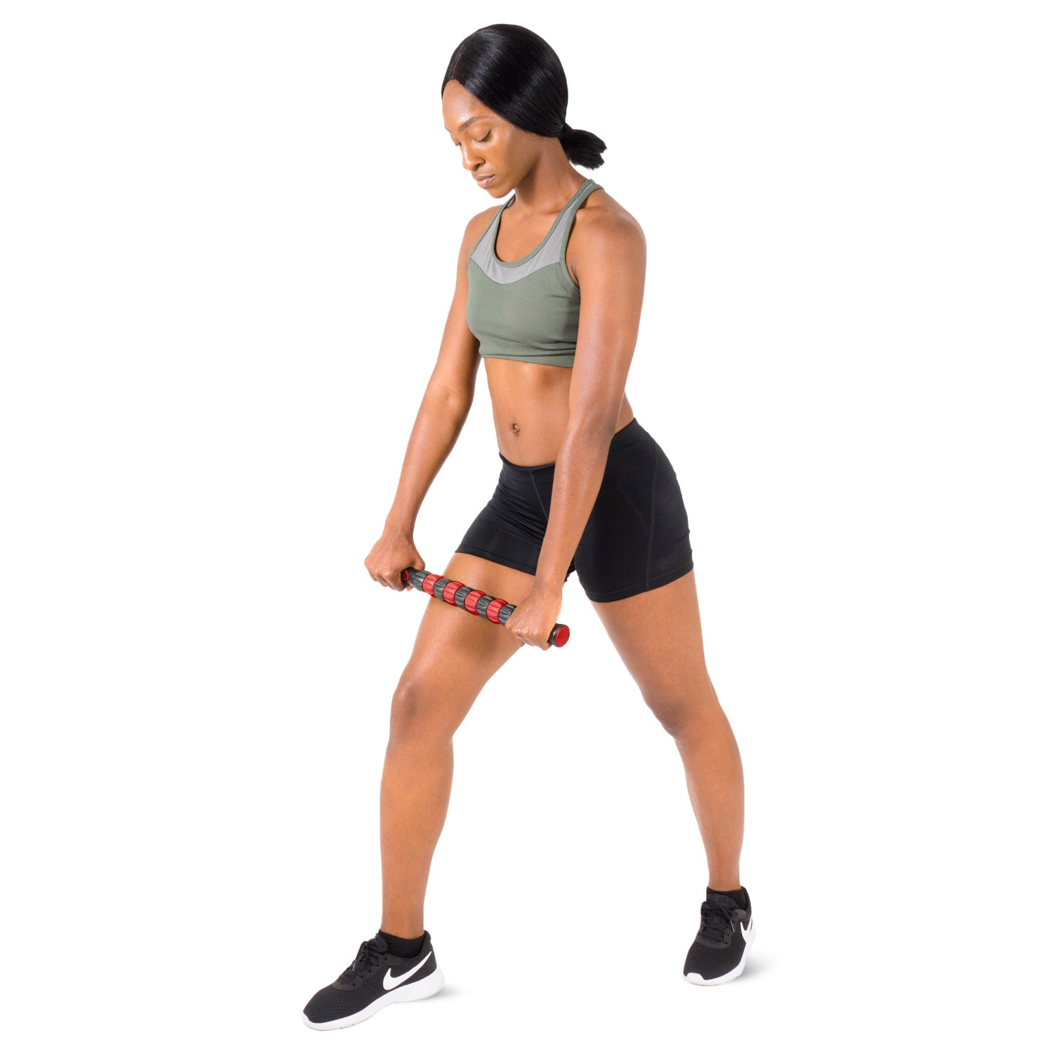 The Massage Stick Roller is a convenient way to roll out your calves, shins, thighs, back, feet, or any other tight spot on your body. Ideal for runners and weight lifters, the 9 massage rollers are firm for working out tough knots, and comfort grip handles allow you to adjust pressure as needed to reduce cramps and muscle pain. Use pre-and-post-workout to increase mobility and athletic performance and reduce muscle imbalances. The slim 18-inch long stick is perfect for storing in your gym bag or carrying anywhere for a quick massage whenever you need.