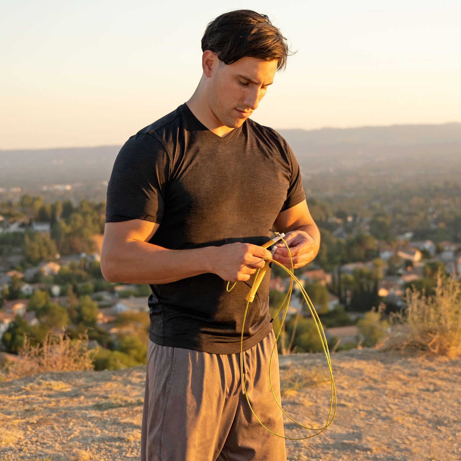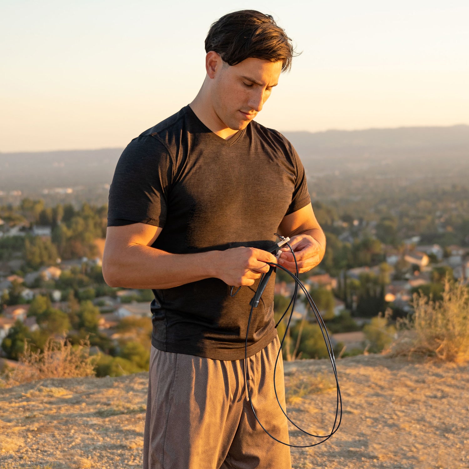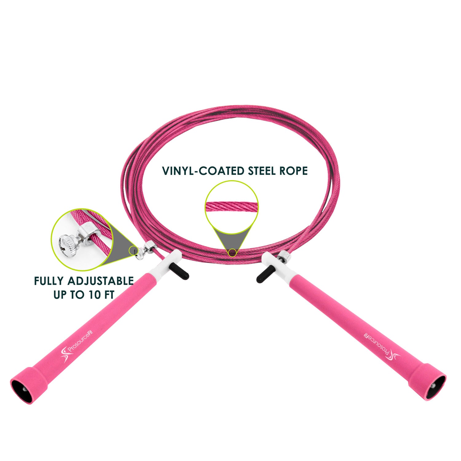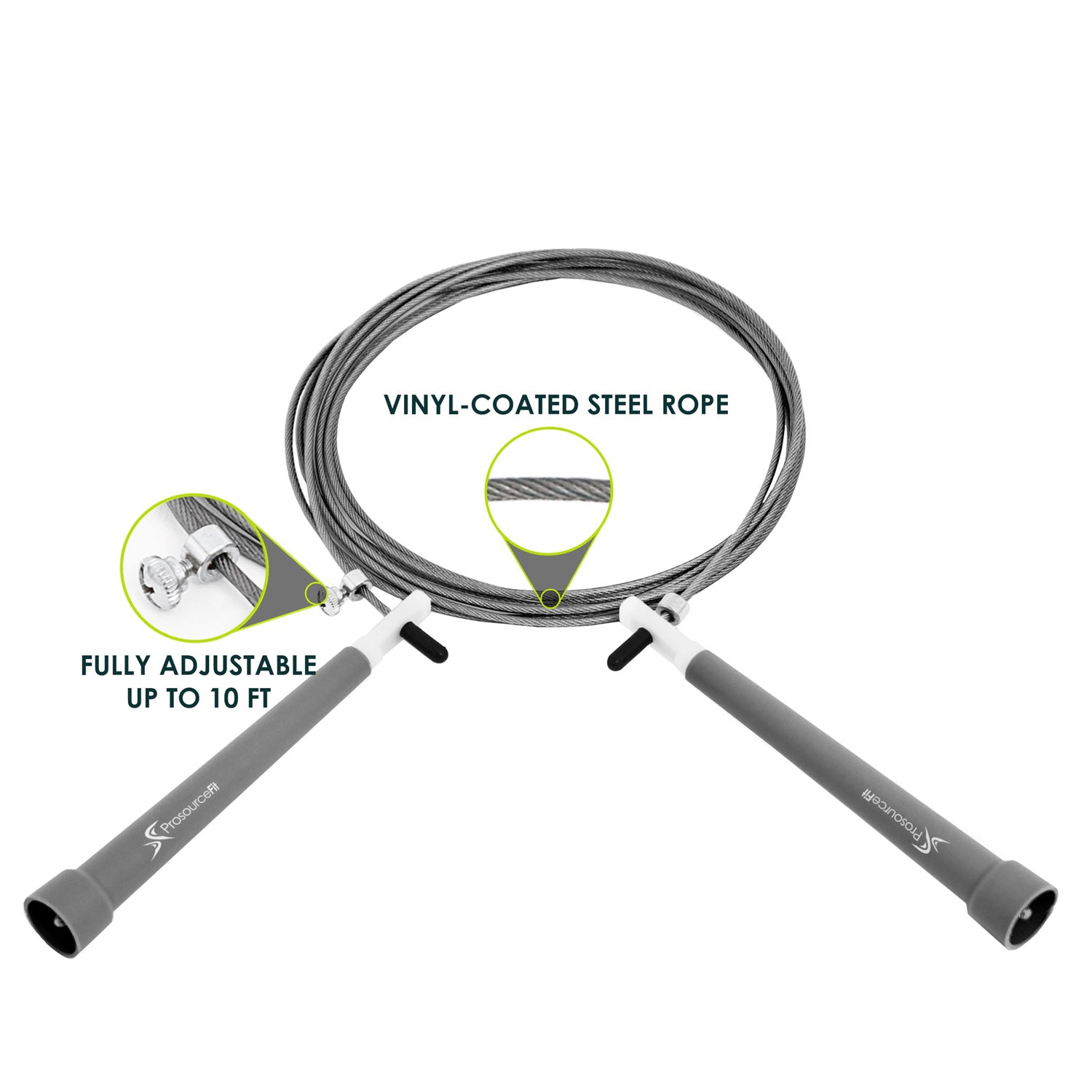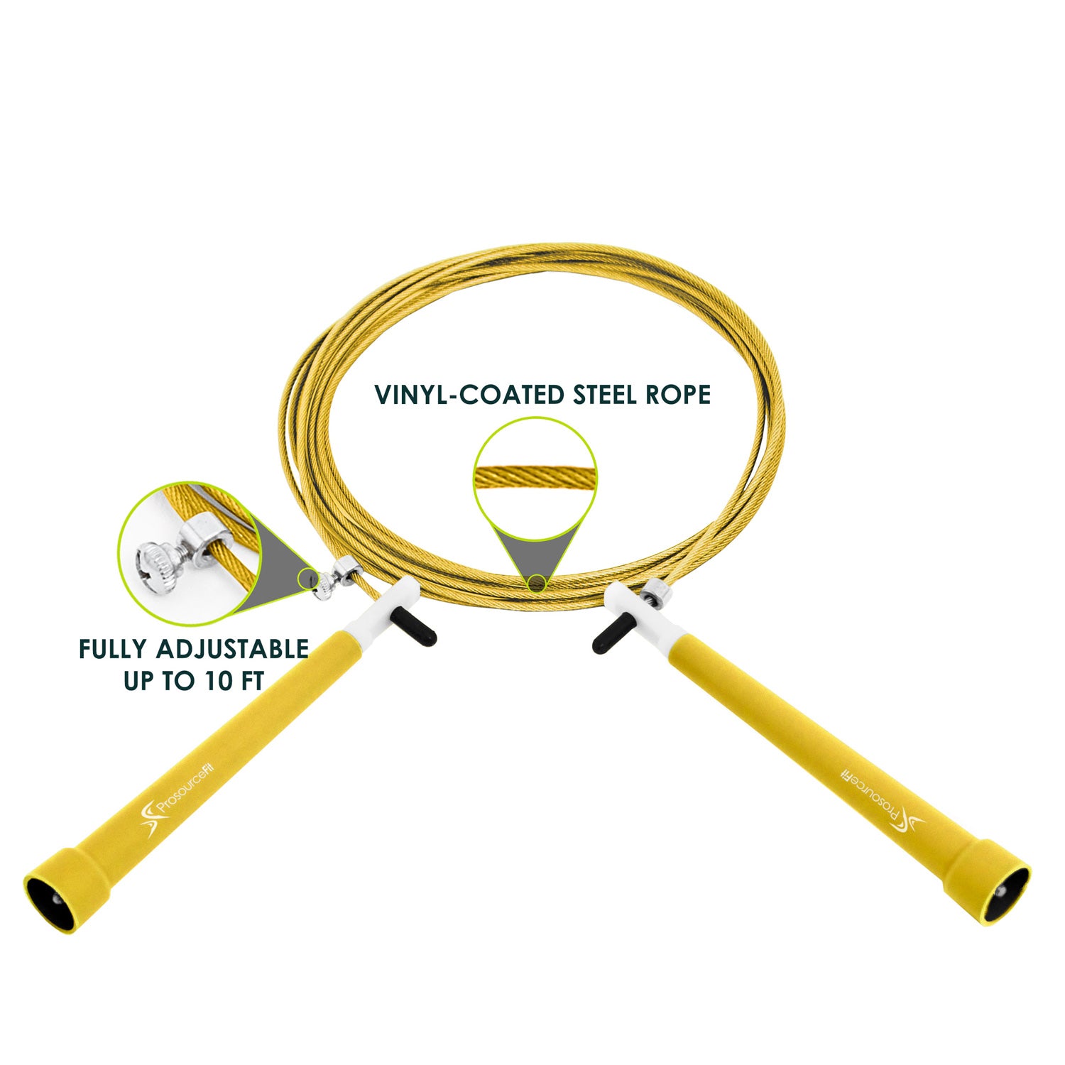 The ProsourceFit Speed Jump Rope uses high quality, durable wire cable that makes speed jumping and double unders easy due to its flexibility and resistance to twisting and tangling. It provides smooth rotation needed for specific jumping techniques for CrossFit, boxing, and experienced athletes. It’s also a great form of cardio exercise for any fitness level, with lightweight plastic handles that are easy to grip and won’t tire out your arms. The cable is adjustable for your height, simply cut and adjust the screws on the handle accordingly. Compact and easy to carry, ropes come in 8 colors to suit your preference and personality.