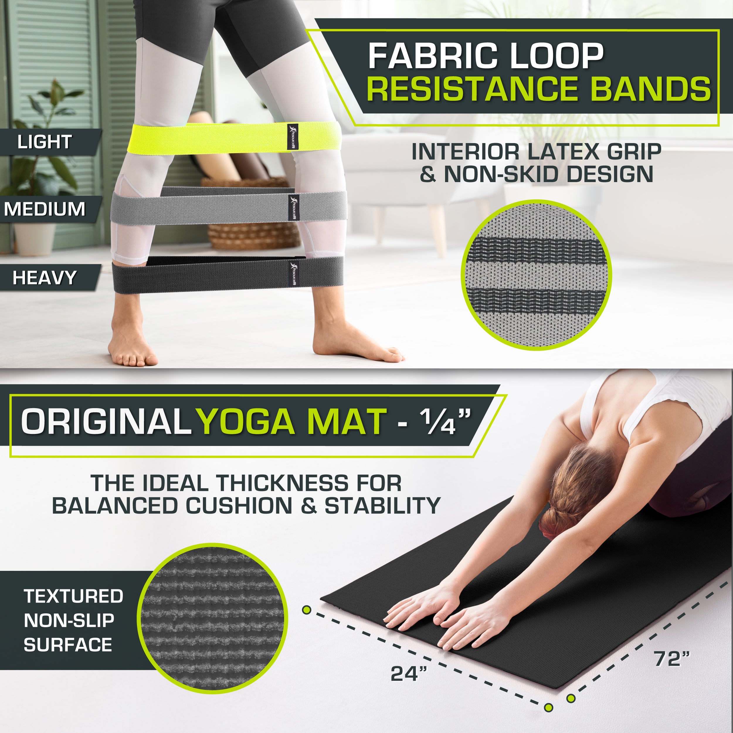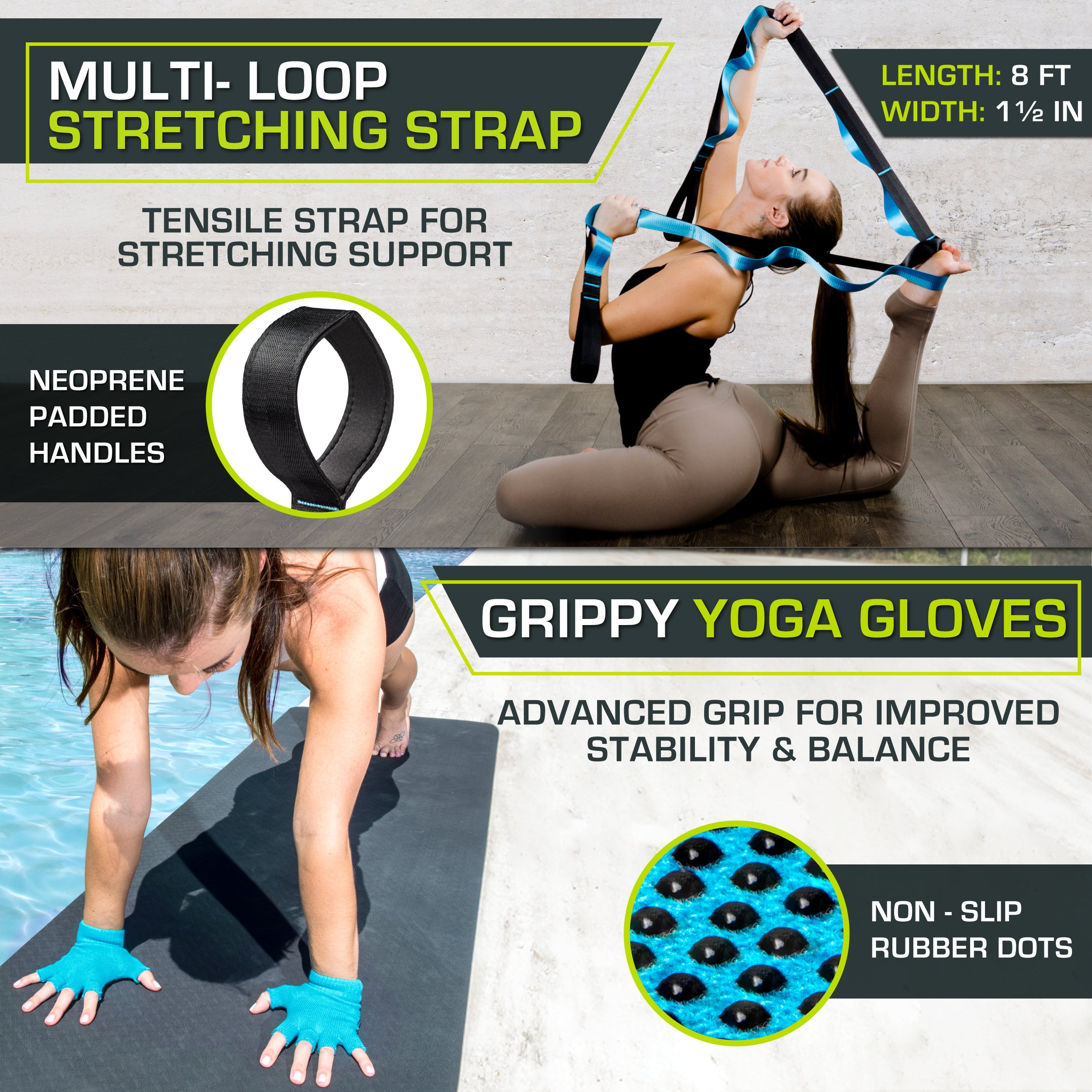 Unfurl your yoga mat and embark on a journey of self-discovery with this 7-piece yoga kit for your practice. As a beginner, explore the foundation of yoga with a stable mat and supportive blocks. The grippy yoga gloves will boost your confidence as you attempt more challenging poses. Feeling tight? The multi-loop stretching strap will guide you towards deeper stretches, while the yoga knee pad protects your joints during floor exercises. But yoga is more than just poses – sculpt your body with fabric resistance bands, improve your backbends with the yoga wheel, and easily transport your gear with the carrying bag. This complete set, available in bold colors or a timeless black & white, is crafted with high-quality materials to be your artistic companion on your yoga journey. Invest in your well-being and discover the art of yoga today.