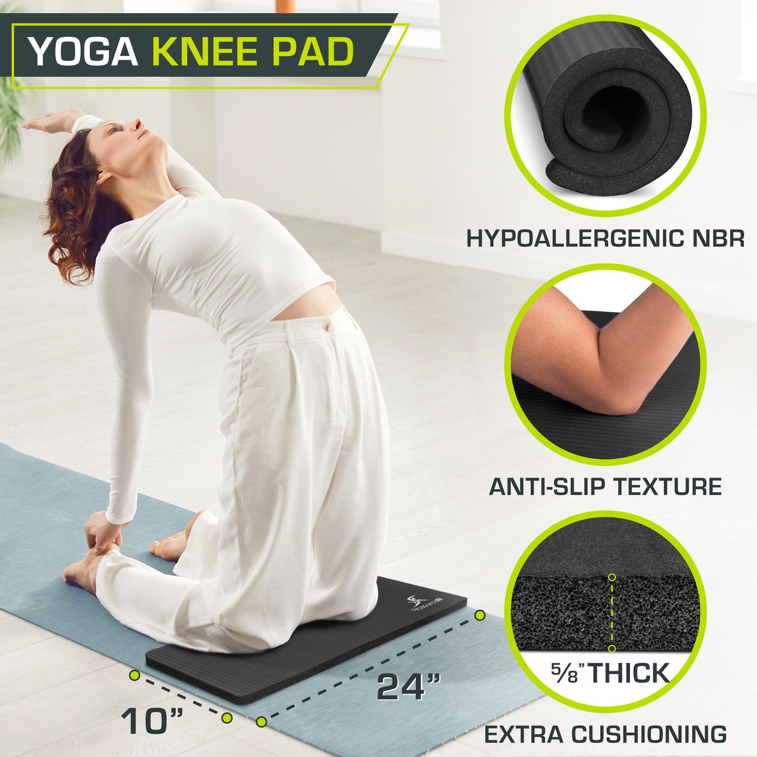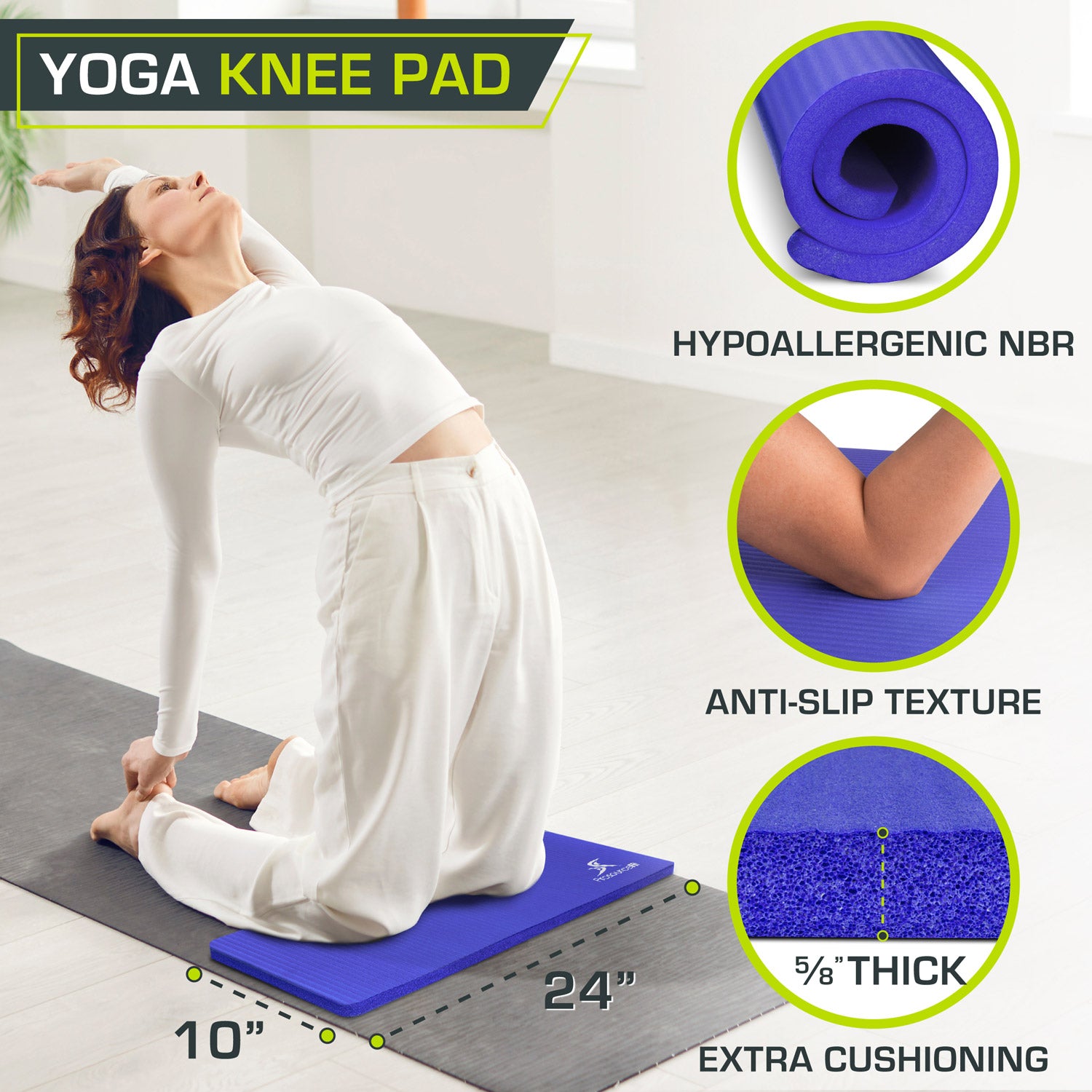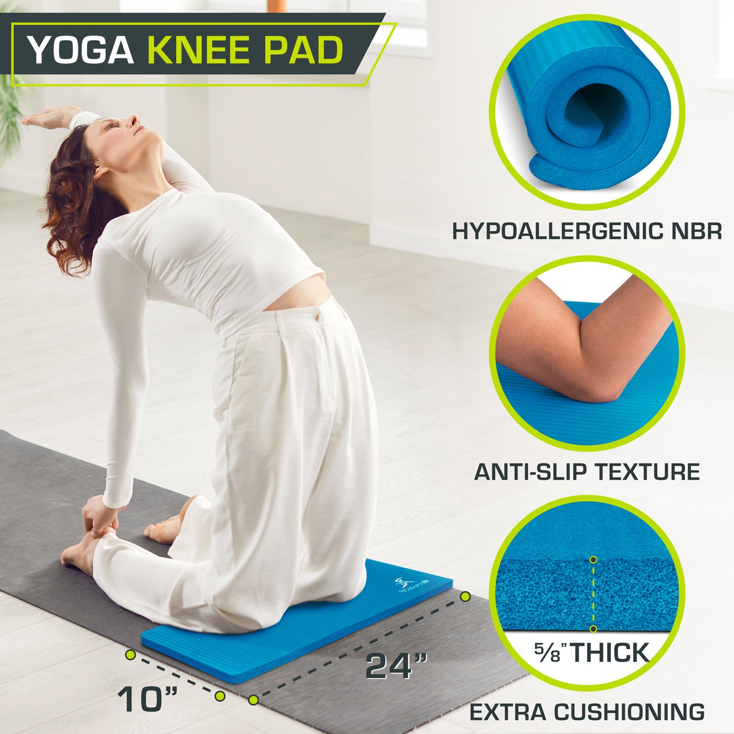 The ProsourceFit Yoga Knee Pad is the perfect solution for achy joints during floor exercises—whether you're doing yoga or not! This compact cushion supports your knees during ab wheel rollouts, doubles as a seat pad, and protects your elbows during plants or other gym movements. Made from 15mm thick high-density NBR foam, it provides just the right amount of support and comfort for floor-based workouts like yoga, Pilates, or stretching. You'll actually enjoy poses like camel, boat, headstands, and bird-dogs—without the nagging joint pain. It's also ideal for cushioning your head during savasana, bridge pose, and other supine postures. Measuring 24 inches long by 10 inches wide, it matches the width of your yoga mat to seamlessly support your practice without the bulk or fuss of folded blankets. Lightweight and easy to roll up, it's convenient to carry and quick to position wherever you need extra padding. The eco-friendly NBR material is non-slip, waterproof, and easy to clean—making it great for everything from restorative stretches to hot yoga. Plus, it's latex- and phthalate-free for safe, worry-free use. Choose from six colors to match your unique yogi style.